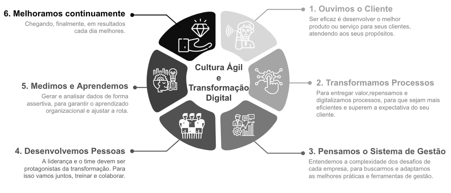 Acreditamos que a cultura da agilidade deve guiar a transformação digital das empresas. Para isso, trabalhamos com 6 pilares, para garantir que a mudança seja verdadeira e perene.